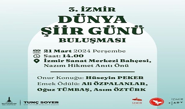 İzmir Büyükşehir Belediye Başkanı Tunç Soyer’in İzmir’i bir kültür kenti haline dönüştürme hedefi doğrultusunda bu yıl üçüncü kez İzmir Dünya Şiir Günü Buluşması düzenlenecek. 21 Mart’ta Kültürpark’ta İzmir Sanat Merkezi Bahçesi Nazım Hikmet Anıtı önünde yapılacak buluşmada şair Hüseyin Peker onur konuğu olacak.
