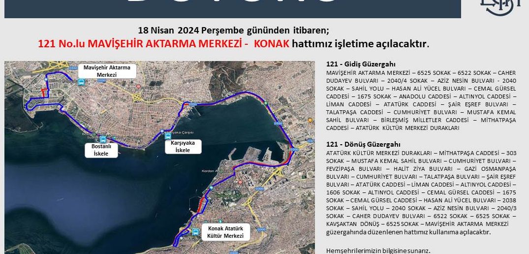 İzmir Büyükşehir Belediye Başkanı Dr. Cemil Tugay, seçimden önce yurttaşlardan gelen yoğun talep üzerine 121 ve 508 numaralı ESHOT hatlarını yeniden devreye alma sözünü tuttu. Mavişehir Aktarma Merkezi-Konak ve Menderes - Konak otobüs hatları, 18 Nisan Perşembe gününden itibaren hizmete açılacak.
