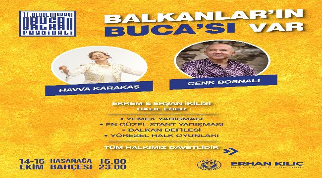 Buca Belediyesi, Balkan kültürünü yaşatmak, kardeşlik bağlarını güçlendirmek amacı ile 14-15 Ekim tarihlerinde 11. Uluslararası Buca Balkan Festivali’ni gerçekleştirecek. ‘Balkanlar’ın Buca’sı Var’ sloganı ile düzenlenen festival, 14 Ekim Cumartesi günü saat 16.00’da Demokrasi Meydanı’ndan Hasanağa Bahçesi’ne gerçekleştirilecek kortej ile başlayacak. Aynı gün saat 18.00’de Ekrem – Erşan ikilisinin konseri yer alırken, saat 20.30’da unutulmaya yüz tutmuş Rumeli türkülerini gün yüzüne çıkararak TRT repertuvarına kazandıran yorumcu Havva Karakaş sahne alacak.